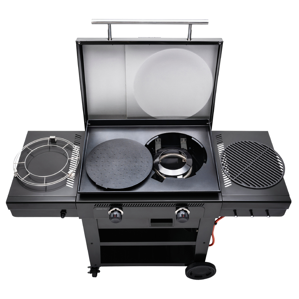 ה-Versa-Tile בעל מערכת הבישול המשולבת. מגדירה מחדש את גריל הגז: שילוב של גריל, פלנצ'ה ותנור פיצה